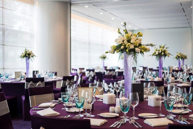 Không gian sang trọng với tông màu trắng – tím chủ đạo tại phòng tiệc Pullman